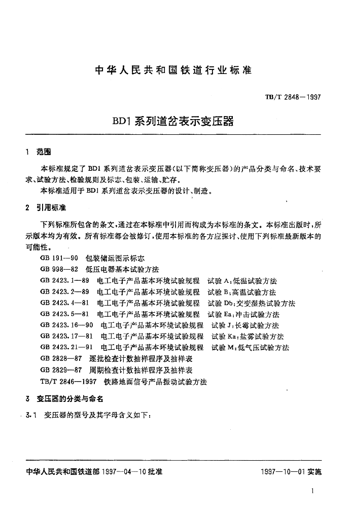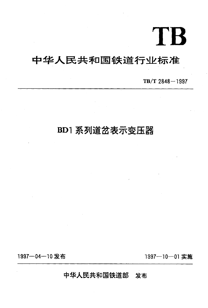 TB/T 2848-1997 BD1系列道岔表示变压器