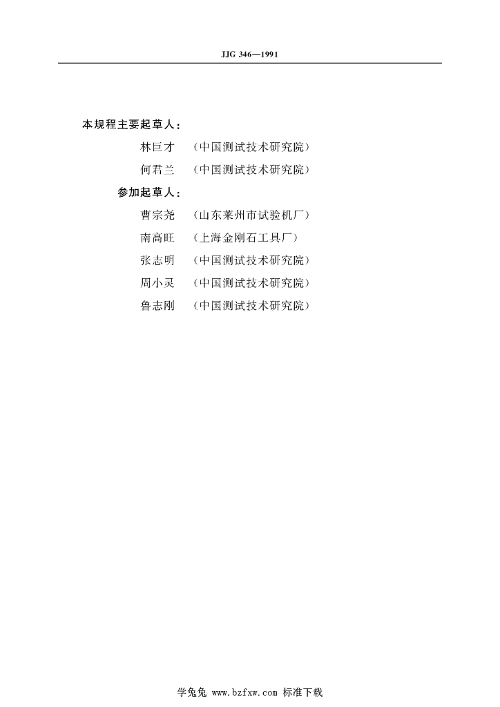 林巨才(中国测试技术研究院)、何君兰(中国测试技术研究院)、曹宗尧(山东莱州市试验机厂)、南高旺(上海金刚石工具厂)、张志明(中国测试技术研究院)、周小灵(中国测试技术研究院)、鲁志刚(中国测试技术研究院)