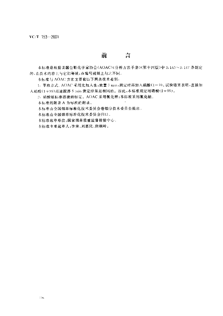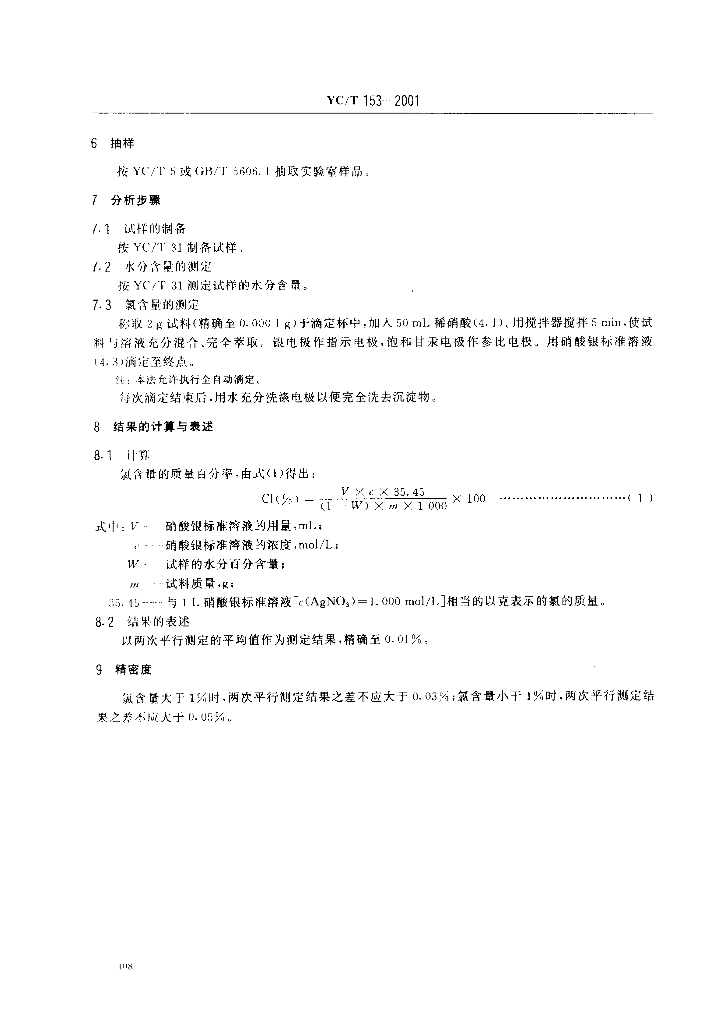 YC/T 153-2001 烟草及烟草制品 氯含量的测定 电位滴定法