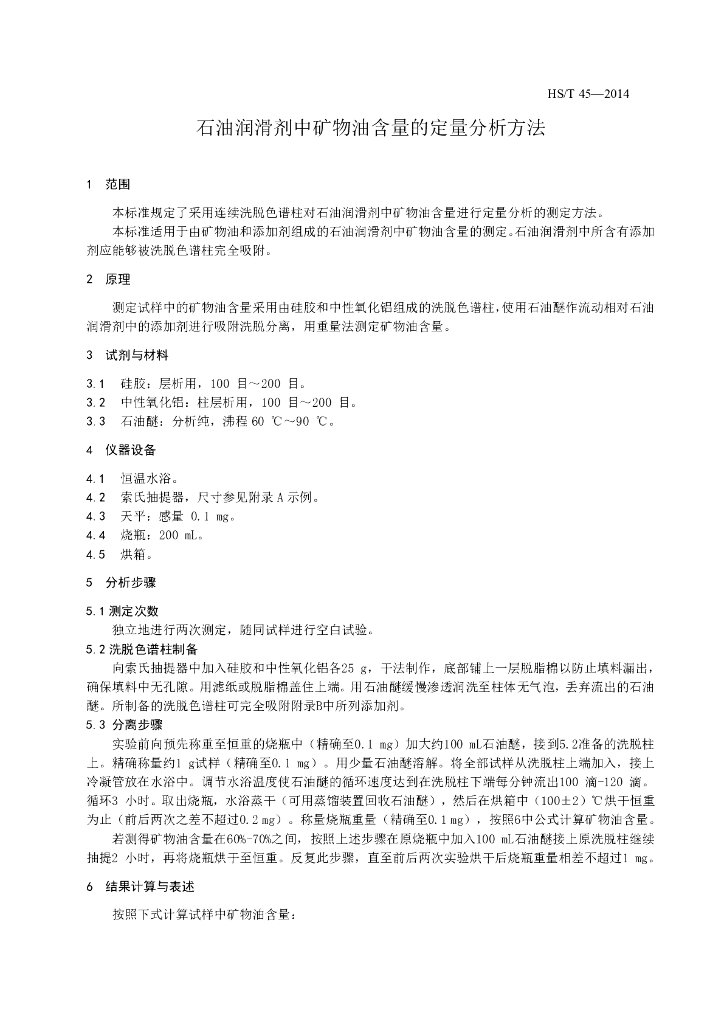 HS/T 45-2014 石油润滑剂中矿物油含量的定量分析方法