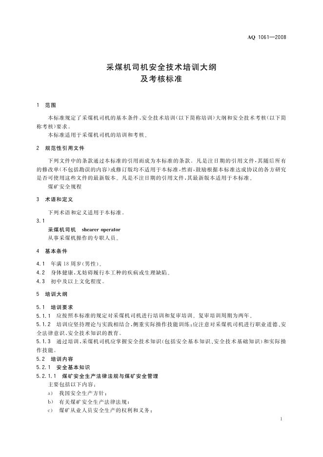AQ/T 1061-2008 采煤机司机安全技术培训大纲及考核标准