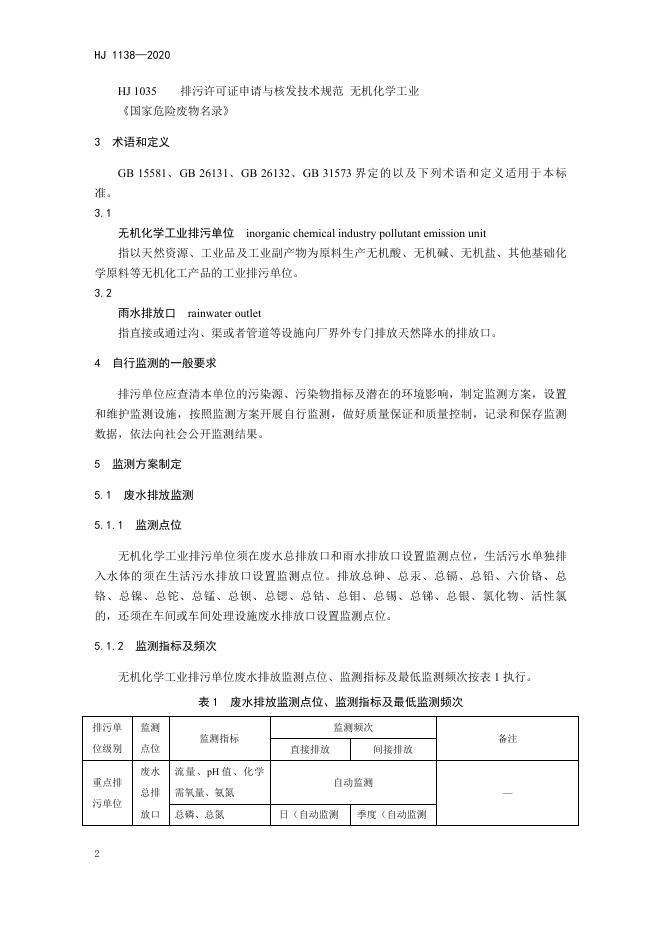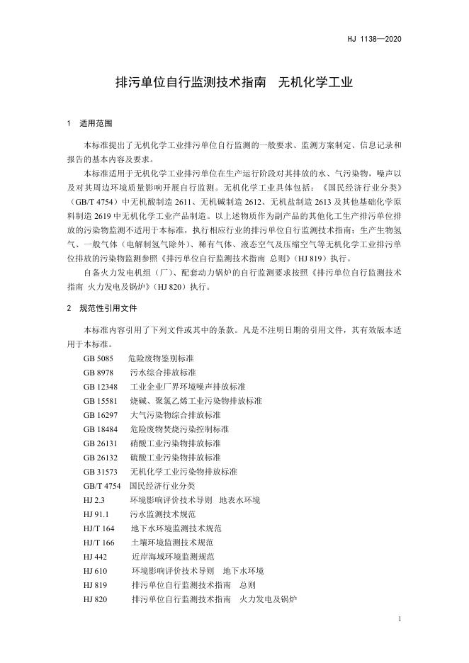 HJ 1138-2020 排污单位自行监测技术指南 无机化学工业