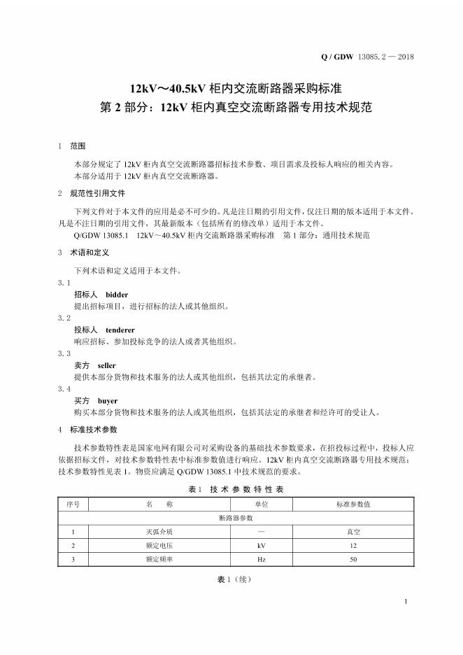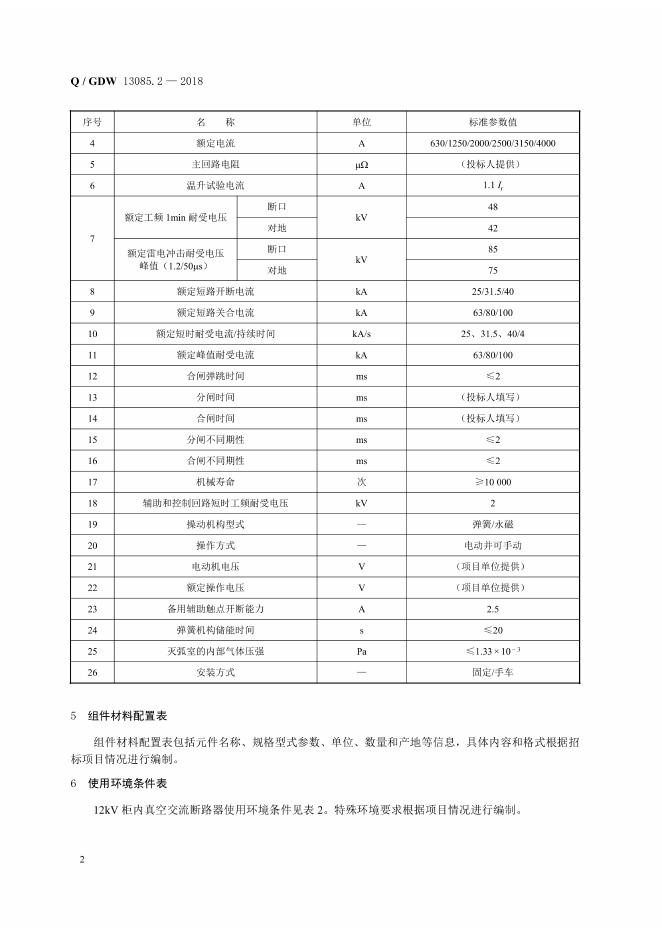 Q/GDW 13085.2-2018 12kV~40.5kV柜内交流断路器采购标准 第2部分:12kV柜内真空交流断路器专用技术规范