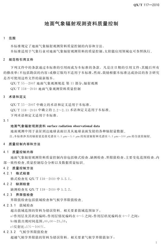 QX/T 117-2010 地面气象辐射观测资料质量控制