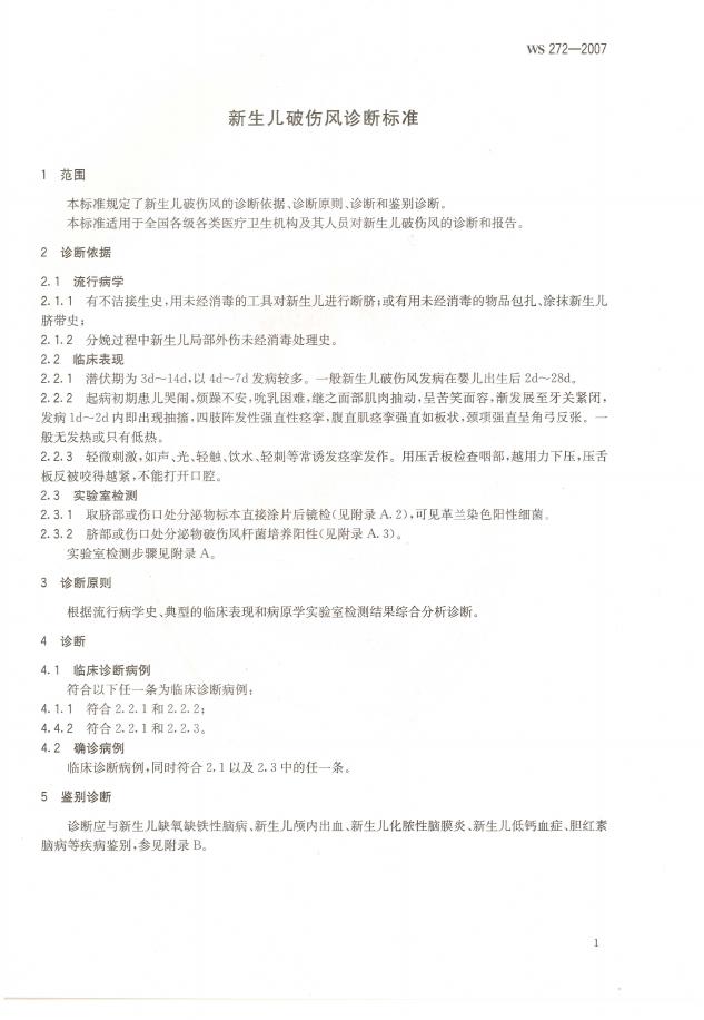 WS 272-2007 新生儿破伤风诊断标准