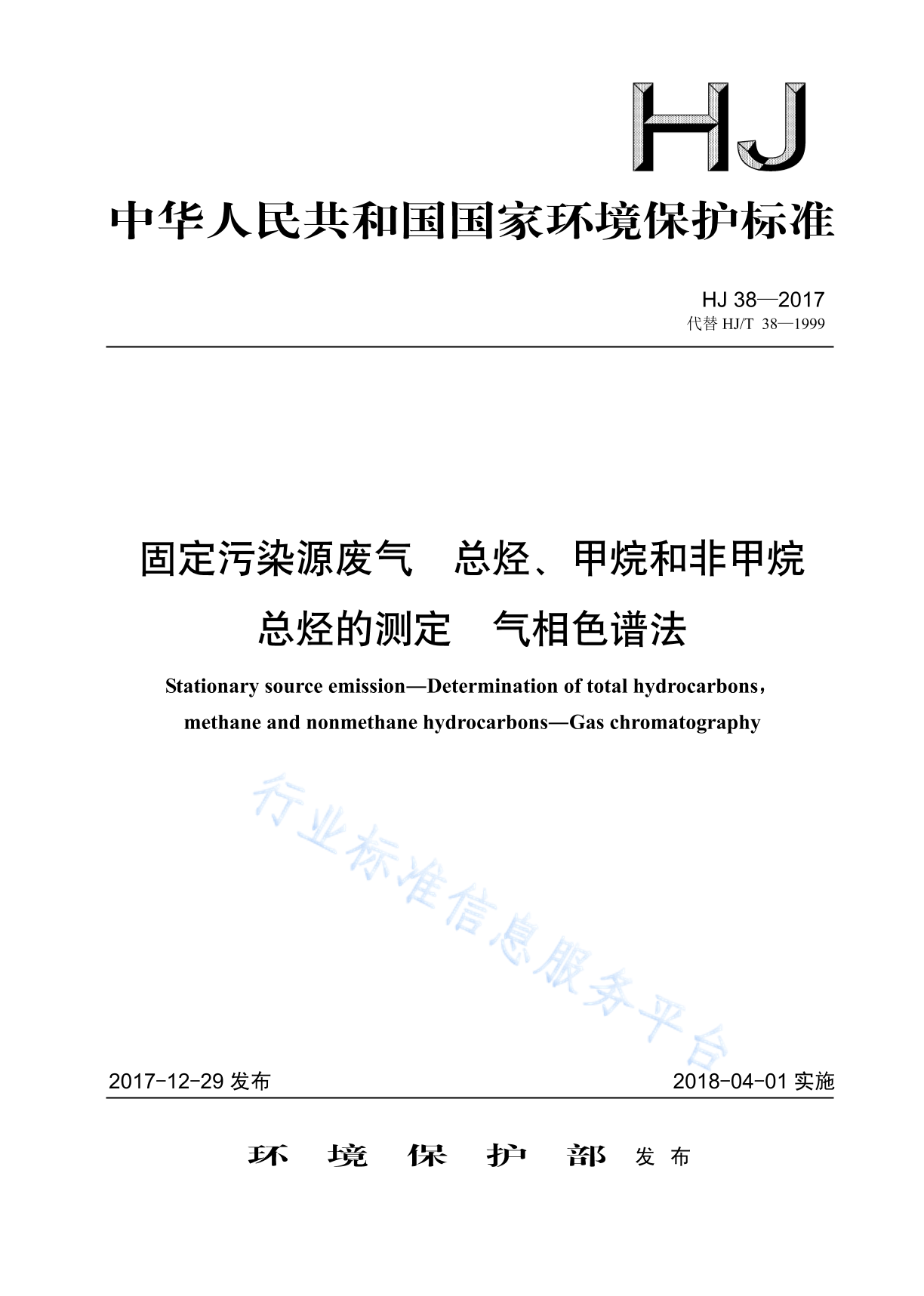HJ 38-2017 固定污染源废气 总烃、甲烷和非甲烷总烃的测定 气相色谱法