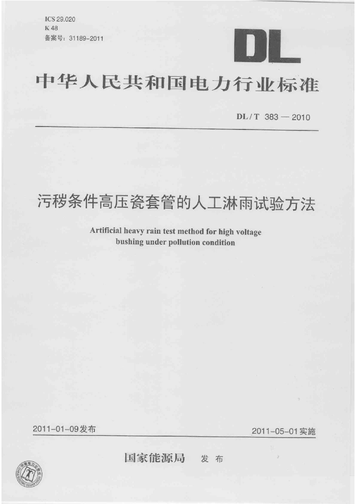 DL/T 383-2010 污秽条件高压瓷套管的人工淋雨试验方法