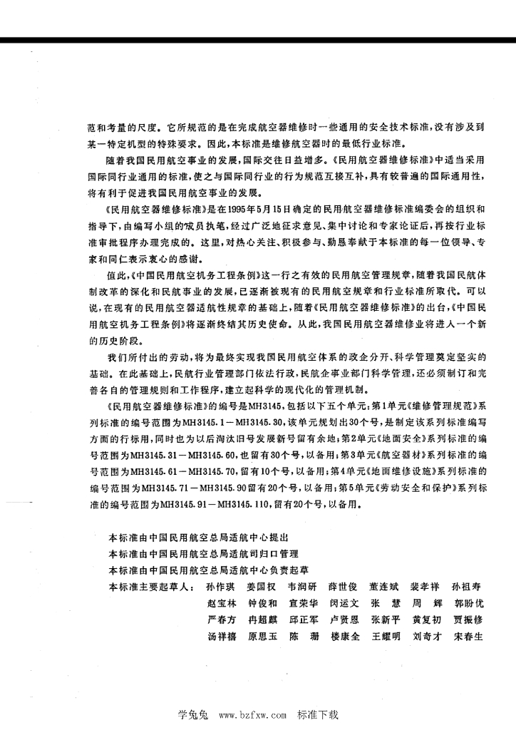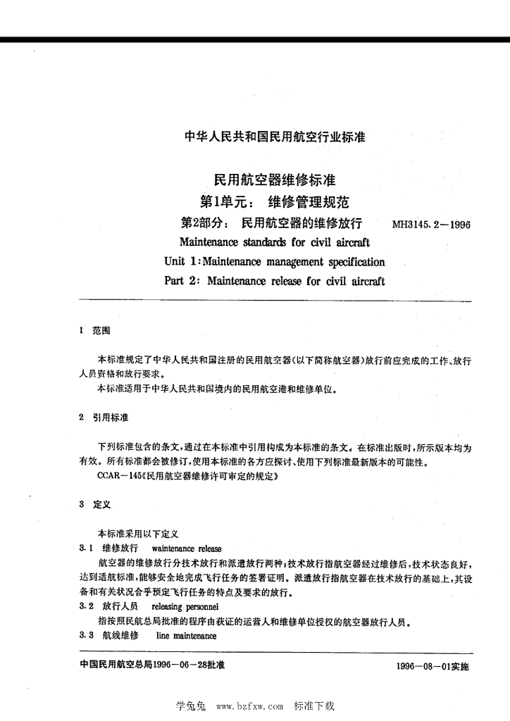 MH 3145.2-1996 民用航空器维修标准 第1单维修管理规范 第2部分:民用航空器的维修放行