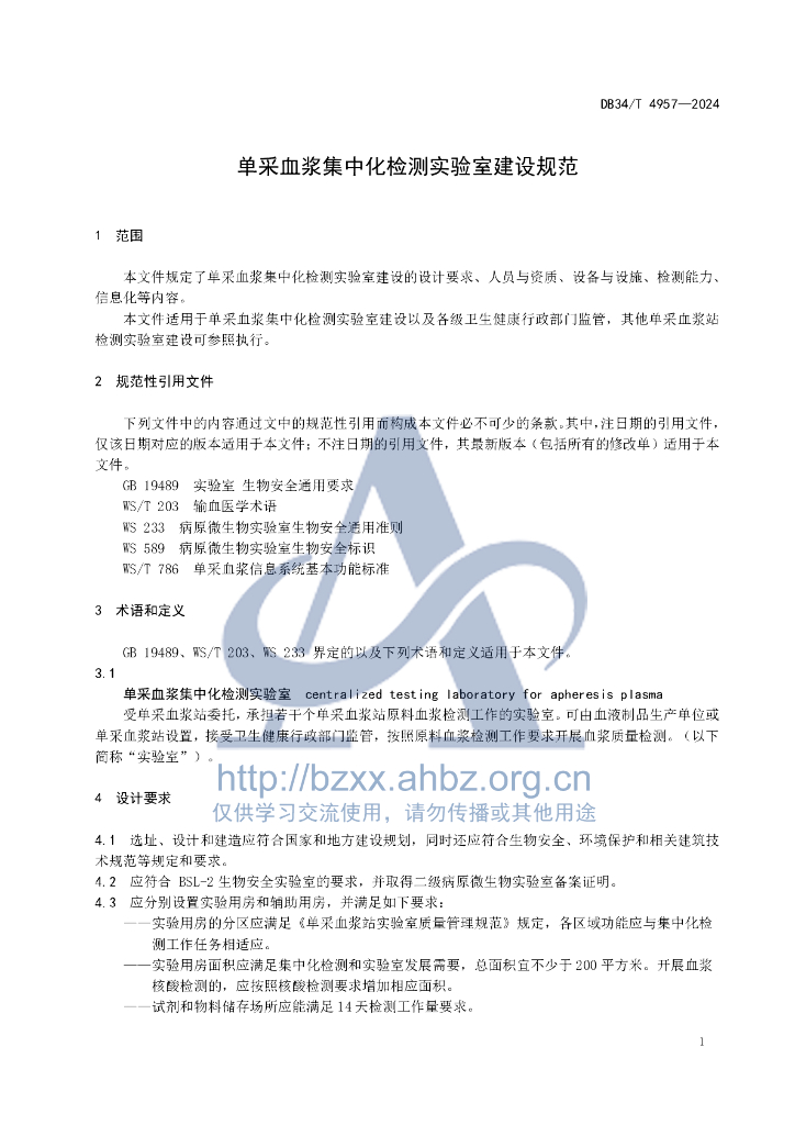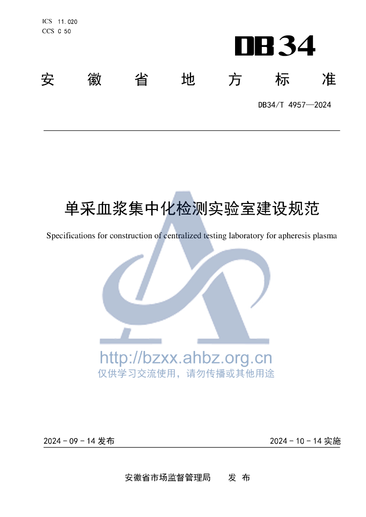 DB34/T 4957-2024 单采血浆集中化检测实验室建设规范