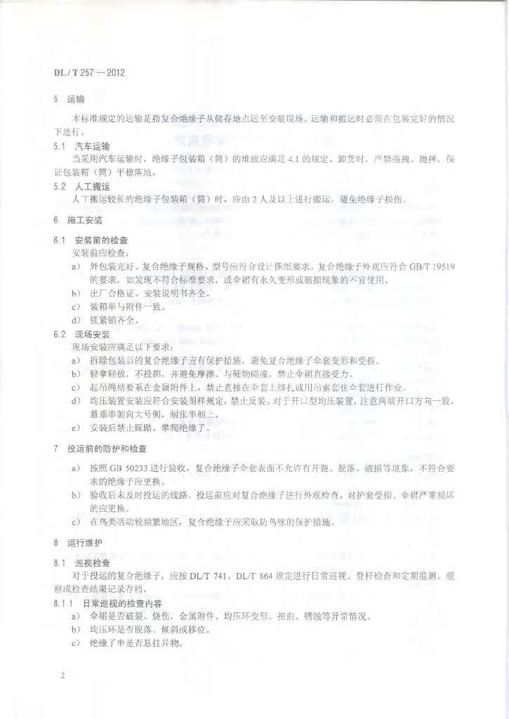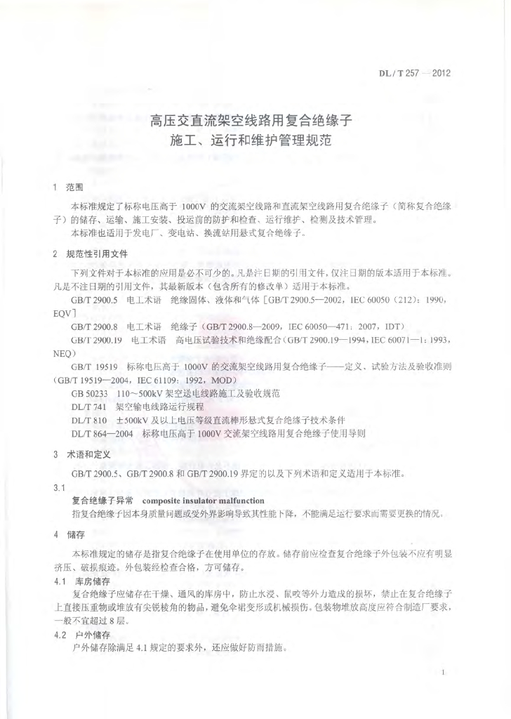 DL/T 257-2012 高压交直流架空线路用复合绝缘子 施工、运行和维护管理规范