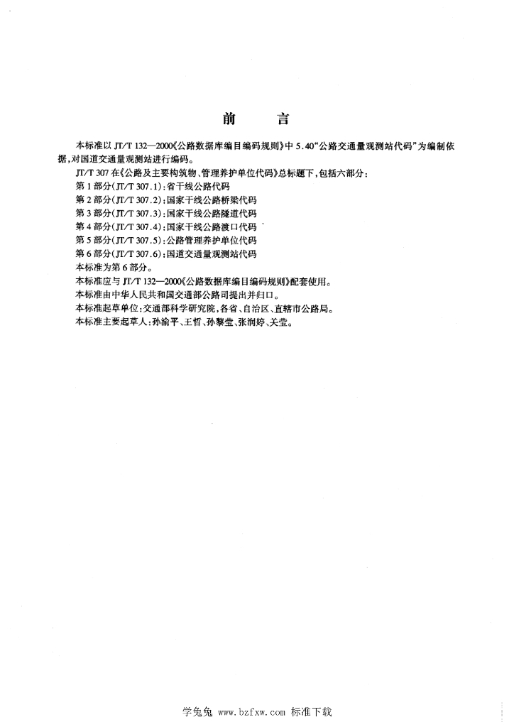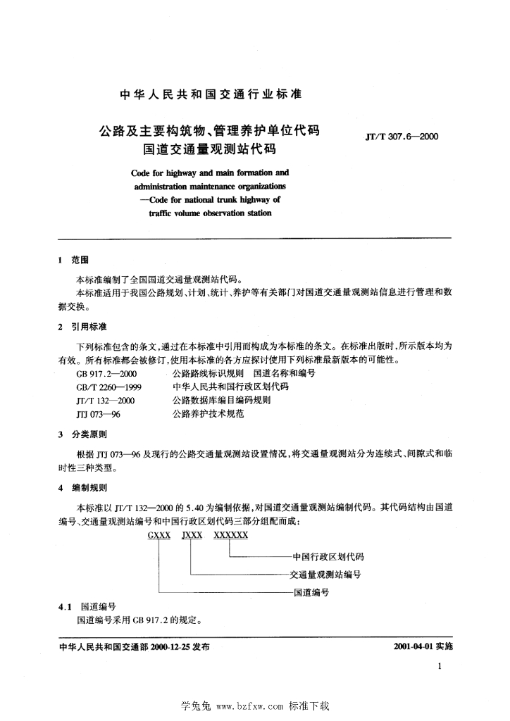 JT/T 307.6-2000 公路及主要构筑物、管理养护单位代码 国道交通量观测站代码