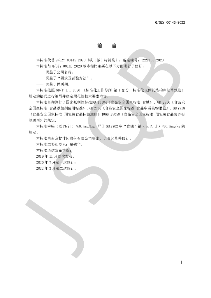 Q/GZY 0014S-2022 枫(槭)树糖浆