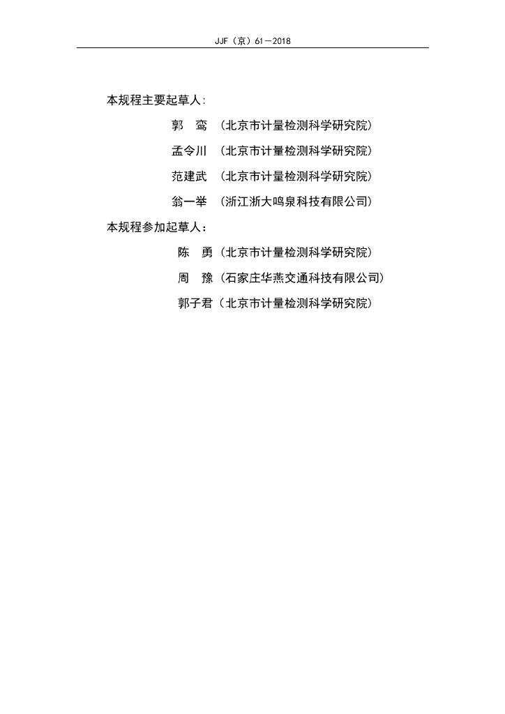 郭鸾(北京市计量检测科学研究院)、孟令川(北京市计量检测科学研究院)、范建武(北京市计量检测科学研究院)、翁一举(浙江浙大鸣泉科技有限公司)、陈勇(北京市计量检测科学研究院)、周豫(石家庄华燕交通科技有限公司)、郭子君(北京市计量检测科学研究院)