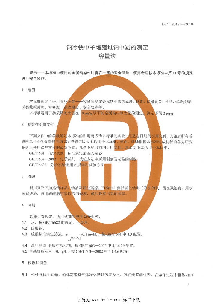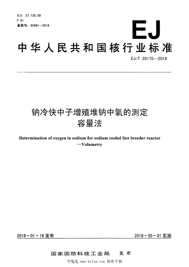 EJ/T 20175-2018 钠冷快中子增殖堆钠中氧的测定 容量法