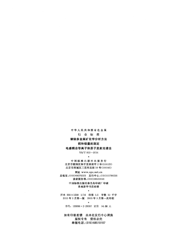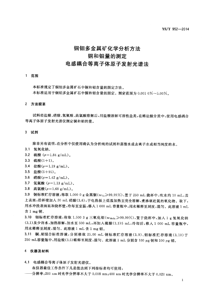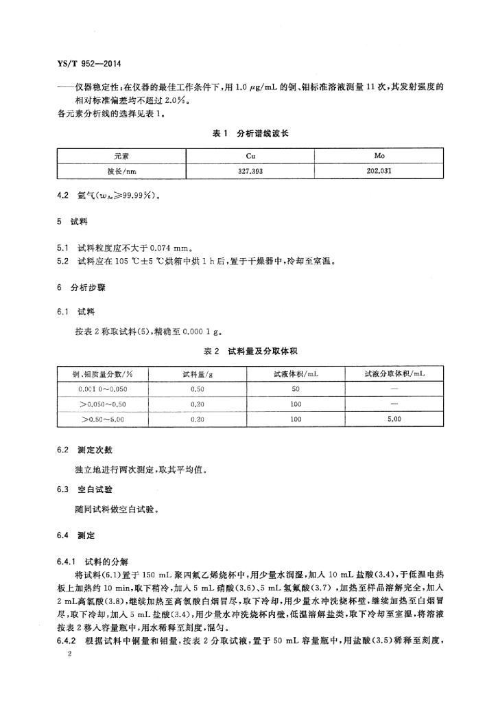 YS/T 952-2014 铜钼多金属矿化学分析方法铜和钼量的测定电感耦合等离子体原子发射光谱法