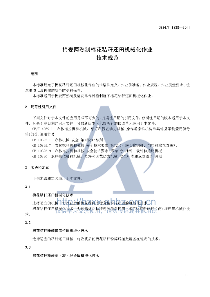DB34/T 1338-2011 棉麦两熟制棉花秸秆还田机械化作业技术规范