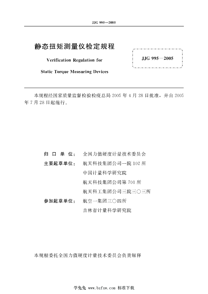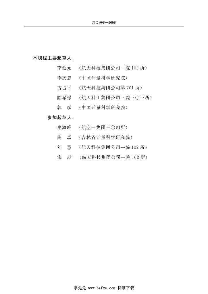 李廷元(航天科技集团公司一院102所)、李庆忠(中国计量科学研究院)、古占平(航天科技集团公司第701所)、陈希禄(航天科工集团公司三院三○三所)、郭斌(中国计量科学研究院)、秦海峰(航空一集团三○四所)、曲卓(吉林省计量科学研究院)、刘慧(航天科技集团公司一院102所)、宋喆(航天科技集团公司一院102所)