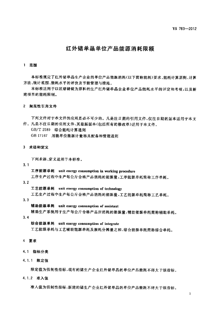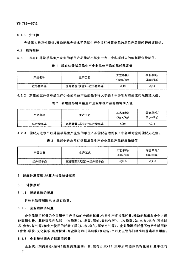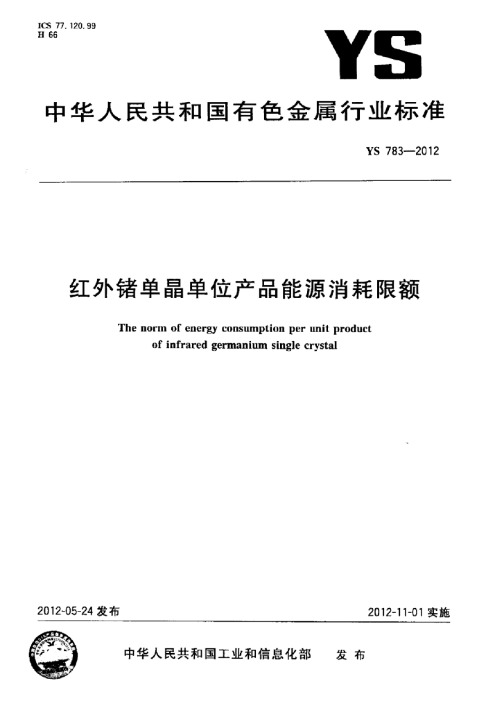 YS 783-2012 红外锗单晶单位产品能源消耗限额