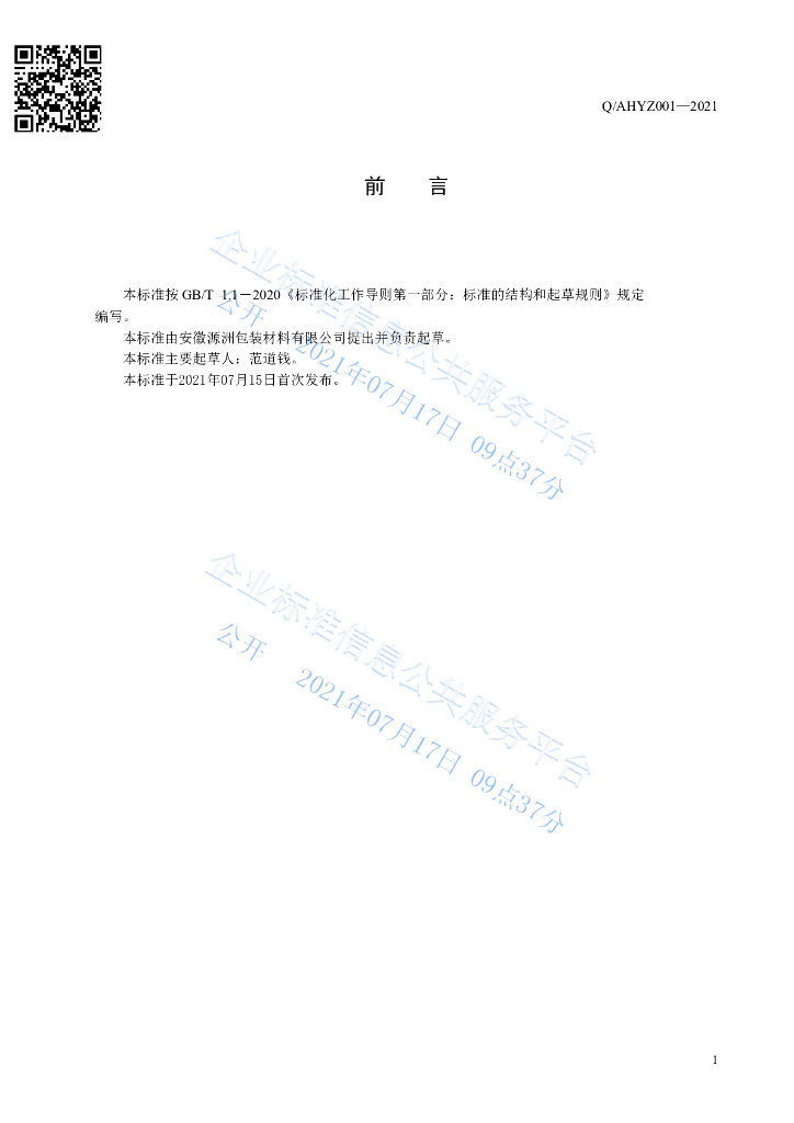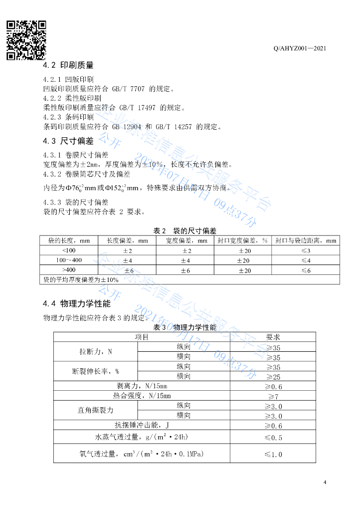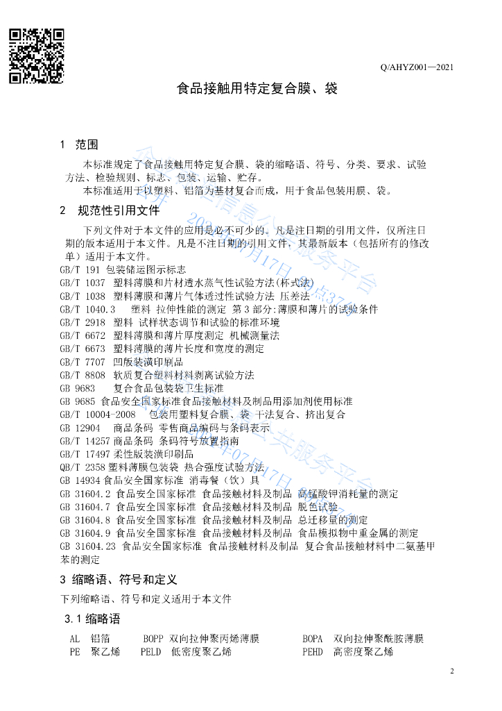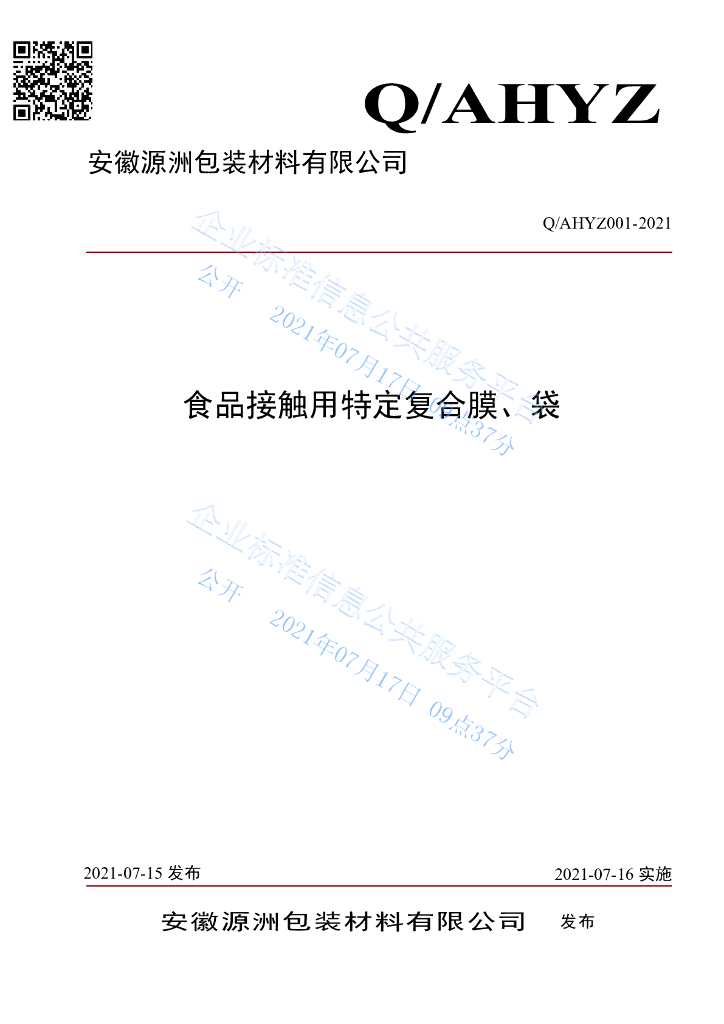 Q/AHYZ 001-2021 食品接触用特定复合膜、袋