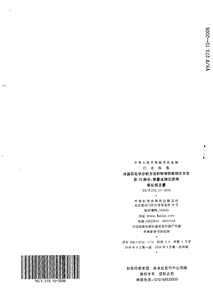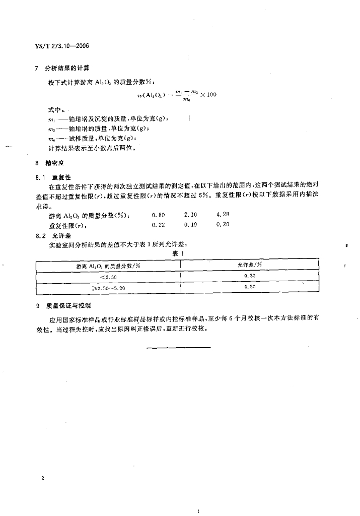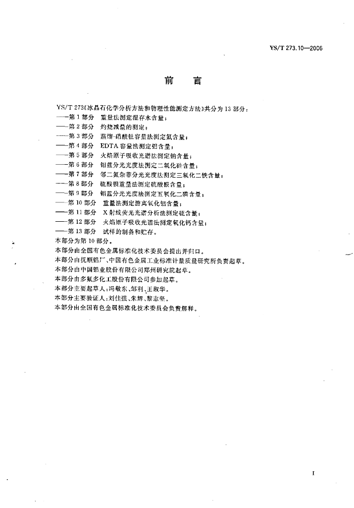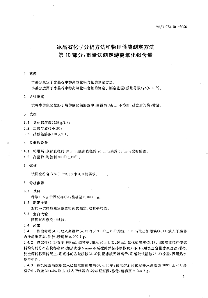 YS/T 273.10-2006 冰晶石化学分析方法和物理性能测定方法 第10部分:重量法测定游离氧化铝含量