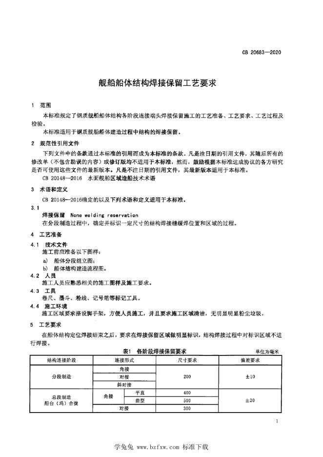 CB 20683-2020 舰船船体结构焊接保留工艺要求