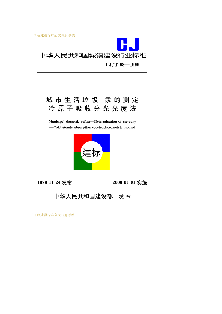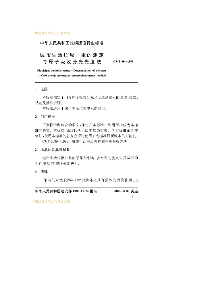 CJ/T 98-1999 城市生活垃圾 汞的测定 冷原子吸收分光光度法