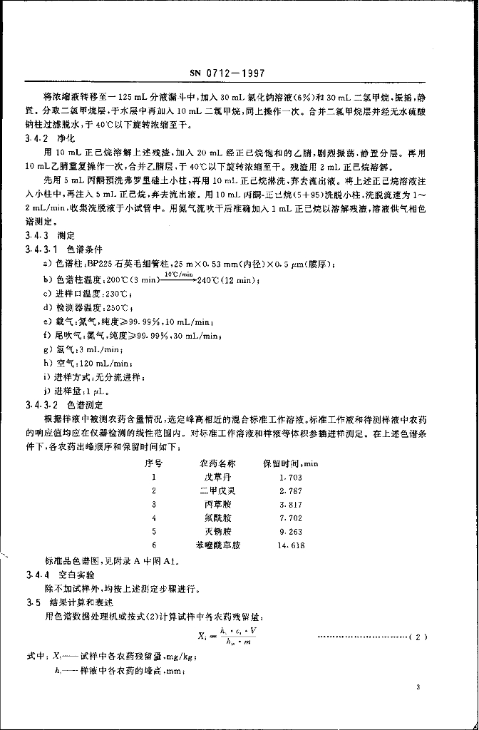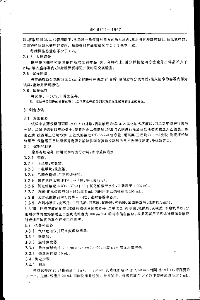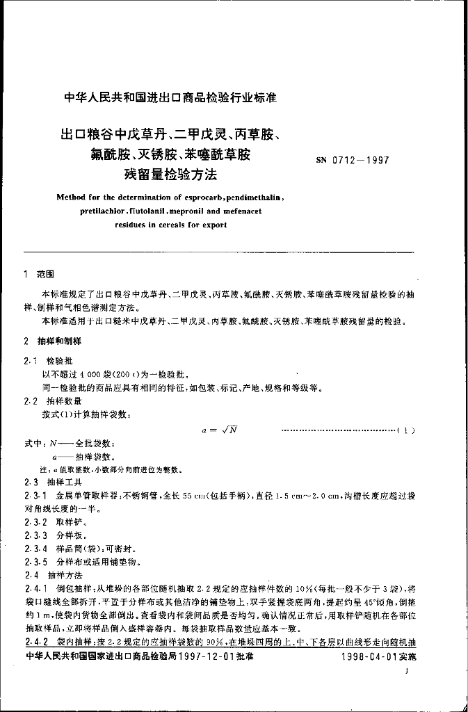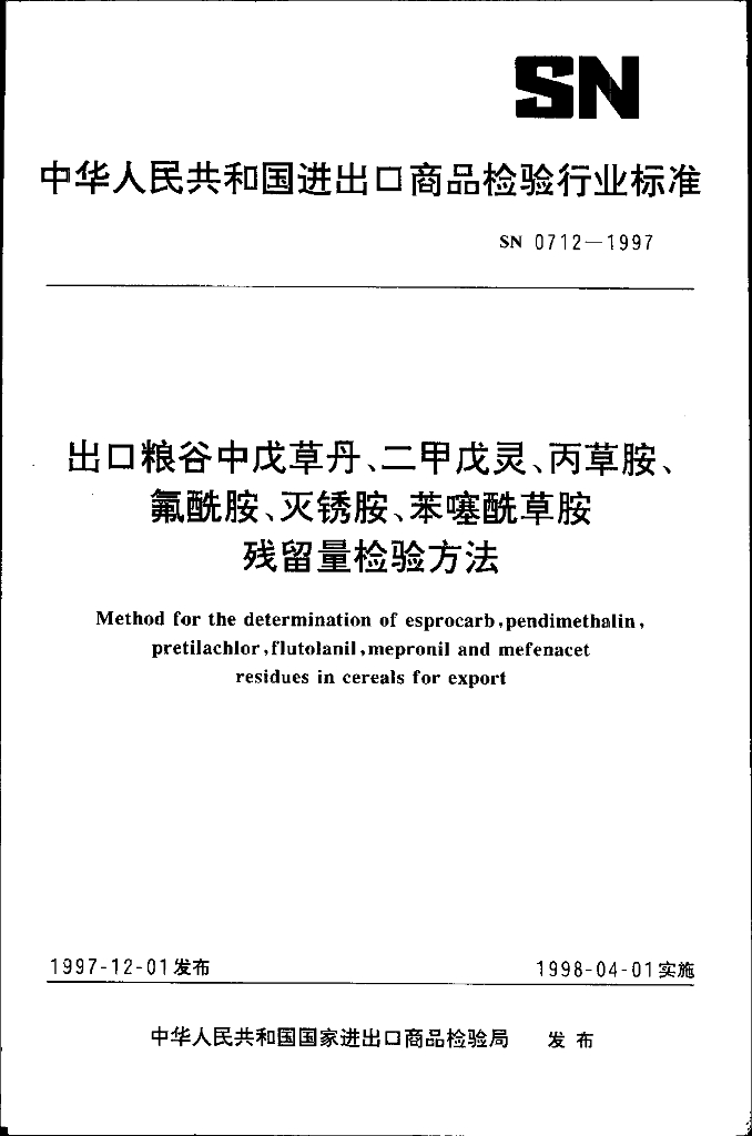 SN 0712-1997 出口粮谷中戊草丹、二甲戊灵、丙草胺、氟酰胺、灭锈胺、苯噻酰草胺残留量检验方法