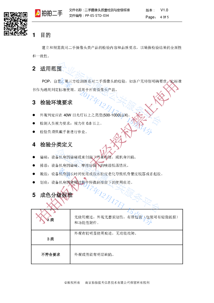 Q/PPESSTD 034-2017 二手摄像头质量检测与定级标准