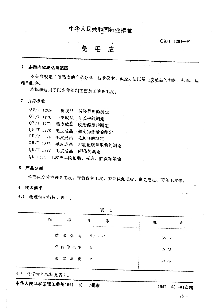 QB/T 1284-1991 兔毛皮