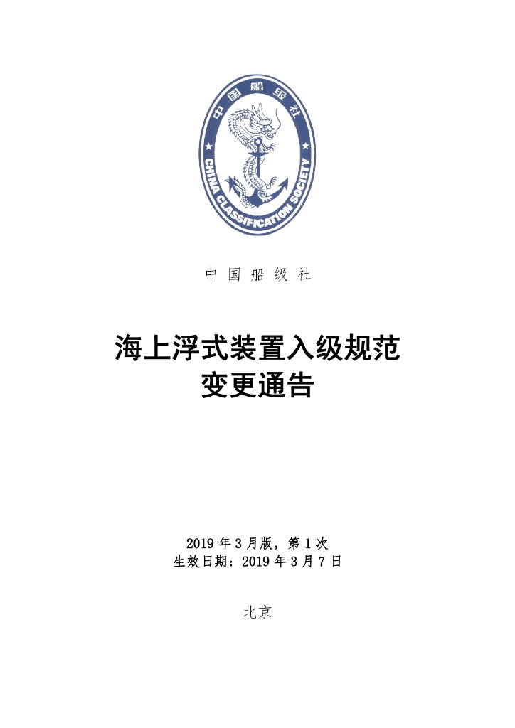 中国船级社CCS:海上浮式装置入级规范2019年第1次规范变更通告
