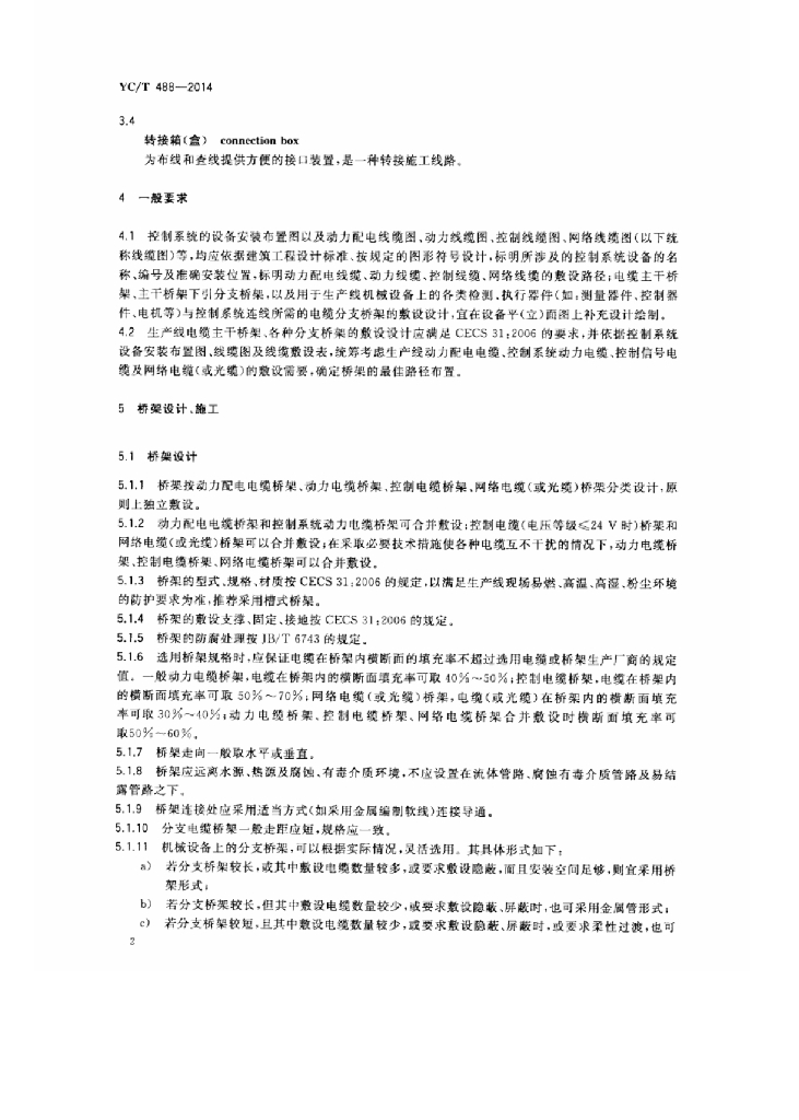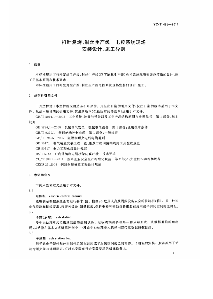 YC/T 488-2014 打叶复烤、制丝生产线 电控系统现场安装设计、施工导则