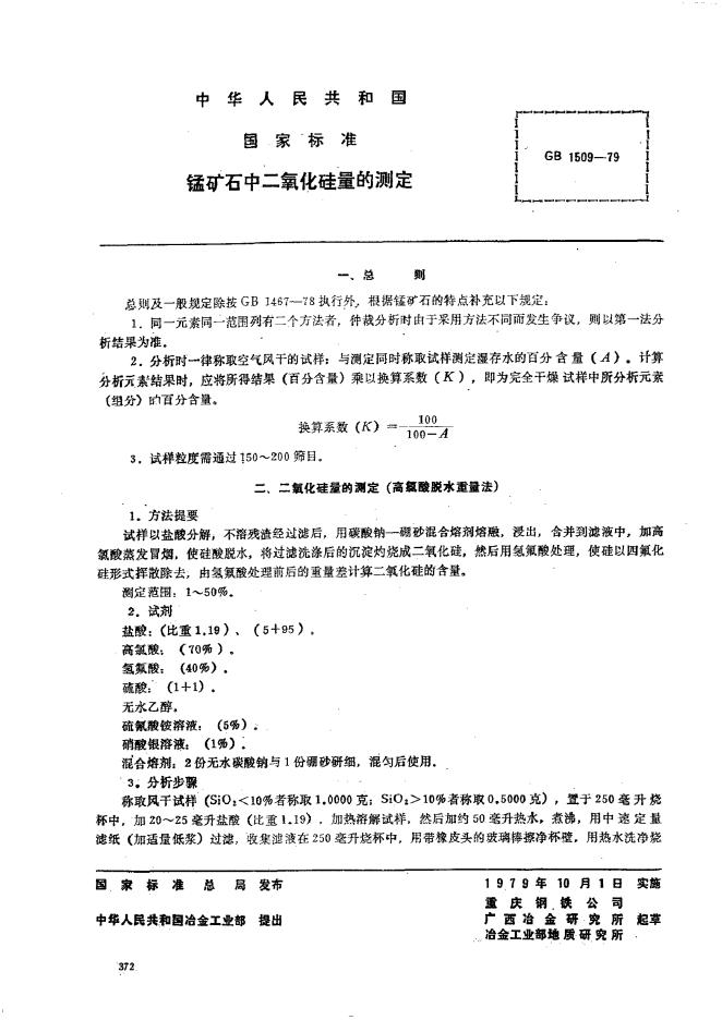 GB/T 1509-1979 锰矿石中二氧化硅量的测定 高氯酸脱水重量法