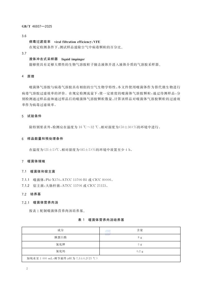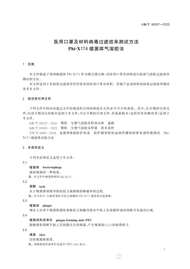 GB/T 46937-2025 医用口罩及材料病毒过滤效率测试方法 Phi-X174噬菌体气溶胶法