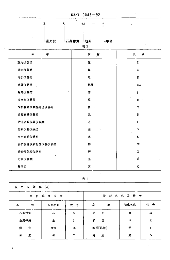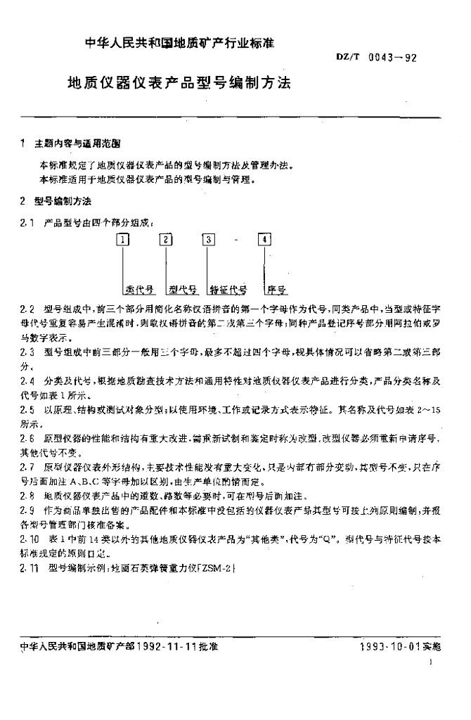 DZ/T 0043-1992 地质仪器仪表产品型号编制方法