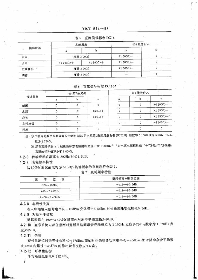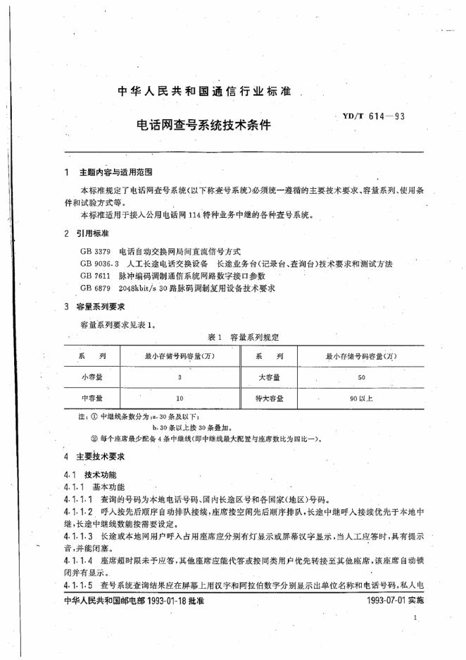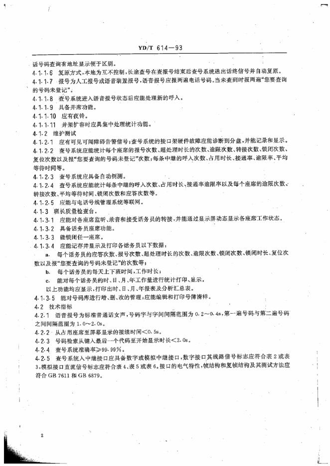 YD/T 614-1993 电话网查号系统技术条件