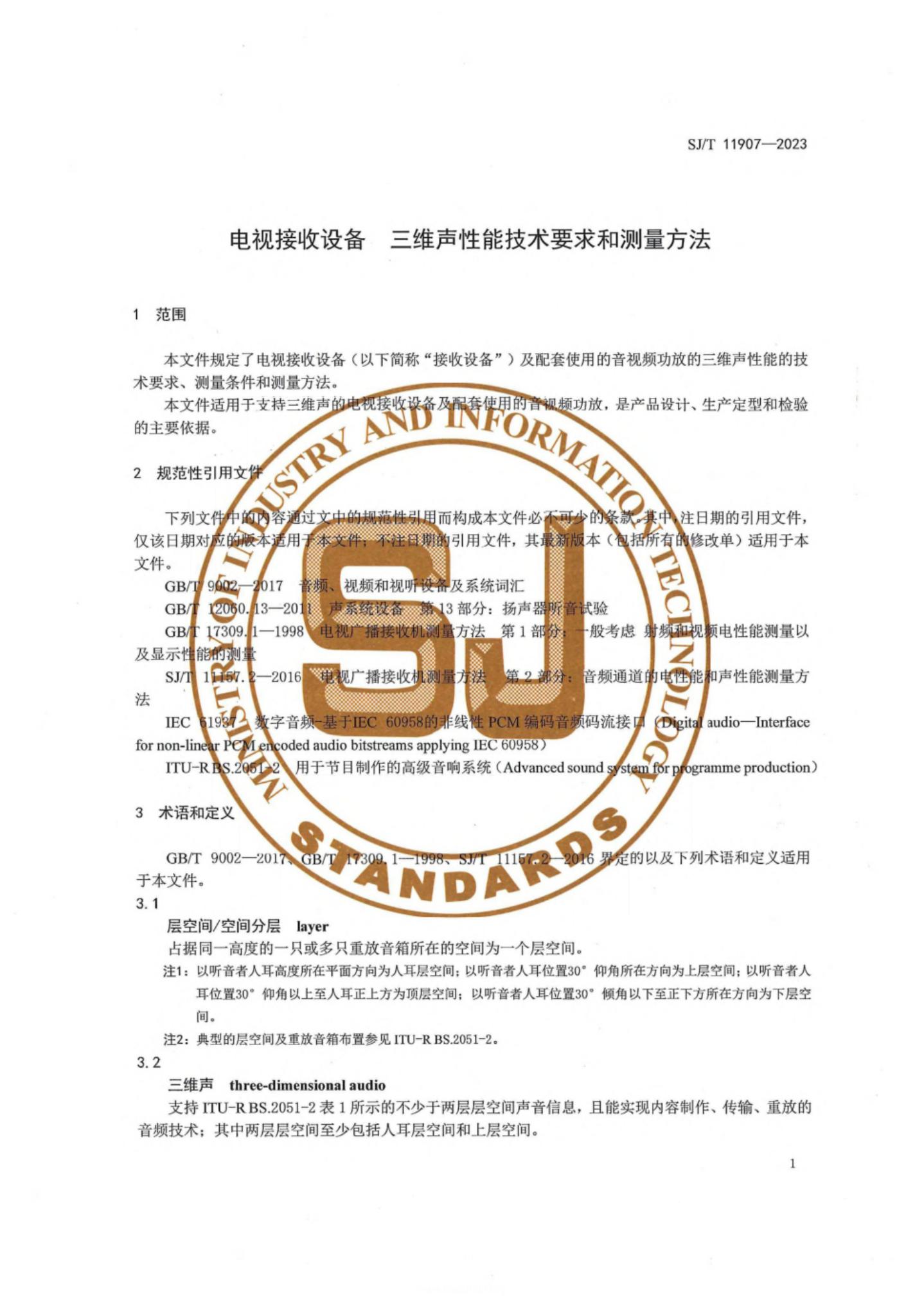 SJ/T 11907-2023 电视接收设备 三维声性能技术要求和测量方法
