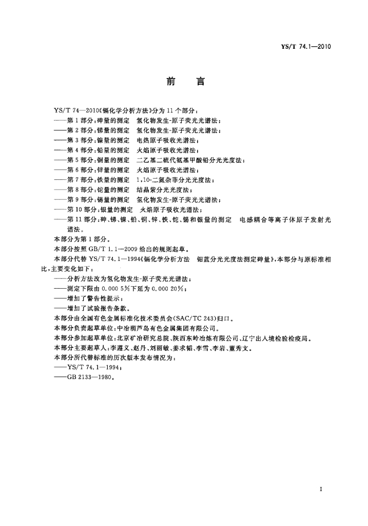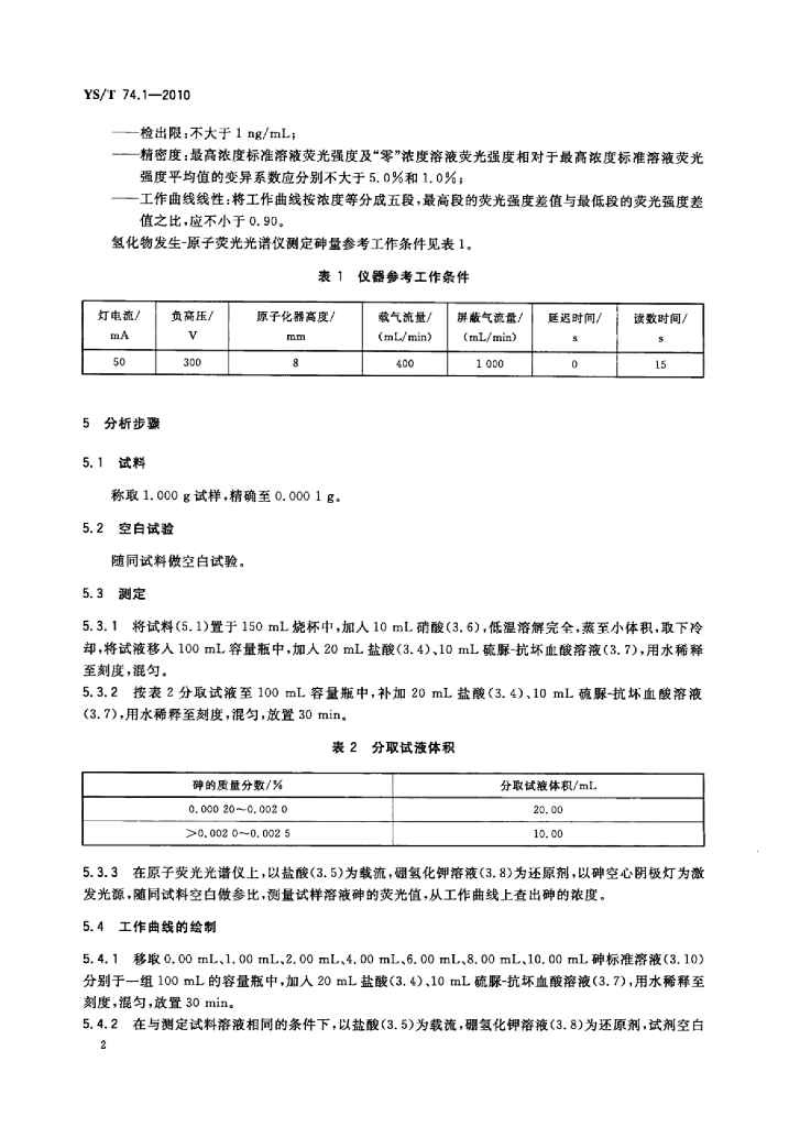 YS/T 74.1-2010 镉化学分析方法 第1部分:砷量的测定氢化物发生-原子荧光光谱法