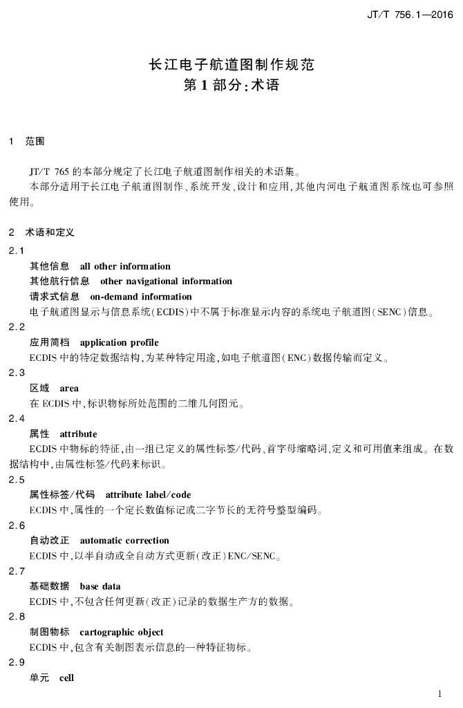 JT/T 756.1-2016 长江电子航道图制作规范 第1部分:术语