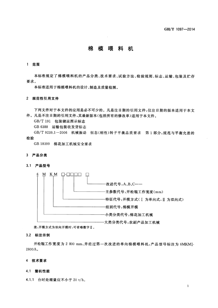 GH/T 1097-2014 棉膜喂料机
