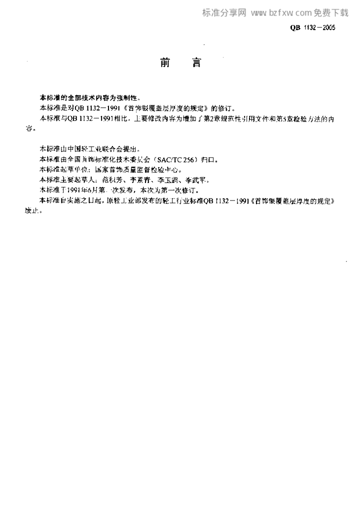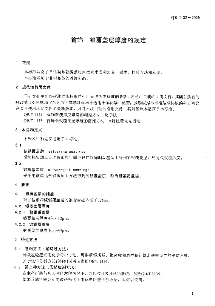 QB 1132-2005 首饰银覆盖层厚度的规定