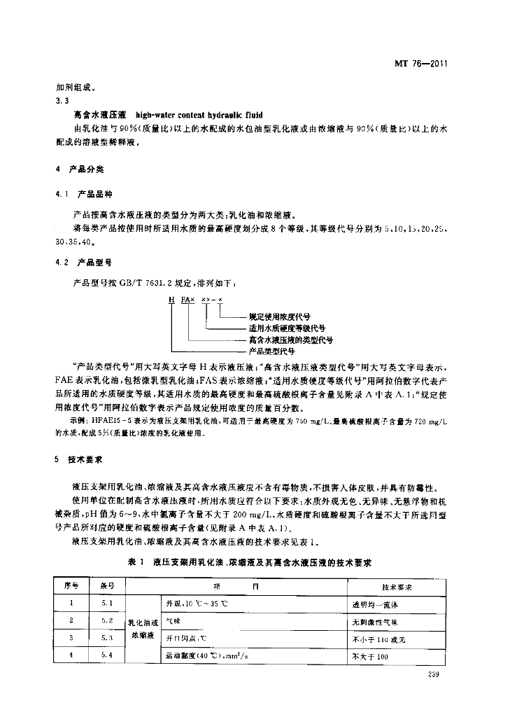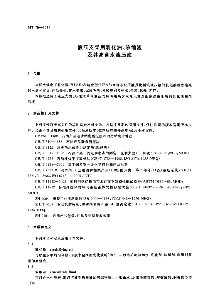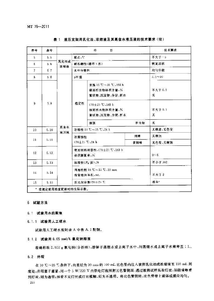 MT 76-2011 液压支架用乳化油、浓缩液及其高含水液压液