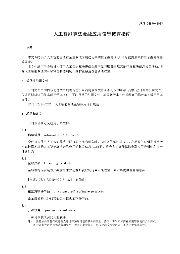 JR/T 0287-2023 人工智能算法金融应用信息披露指南