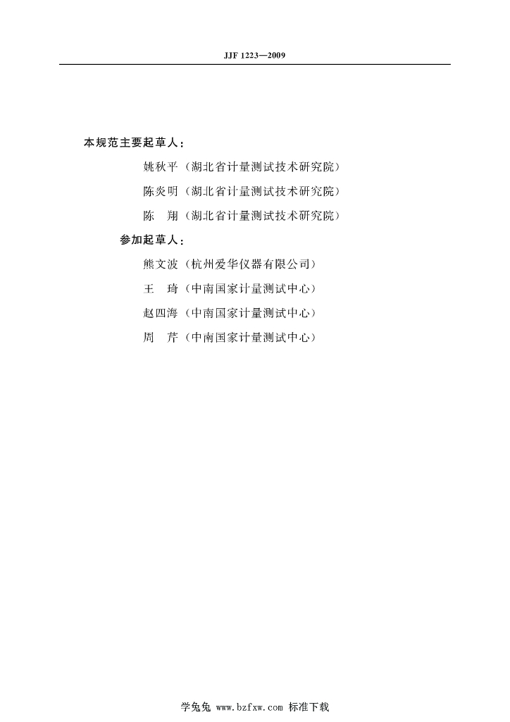 姚秋平(湖北省计量测试技术研究院)、陈炎明(湖北省计量测试技术研究院)、陈翔(湖北省计量测试技术研究院)、熊文波(杭州爱华仪器有限公司)、王琦(中南国家计量测试中心)、赵四海(中南国家计量测试中心)、周芹(中南国家计量测试中心)