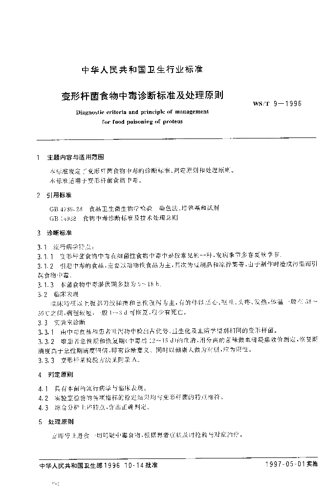 WS/T 9-1996 变形杆菌食物中毒诊断标准及处理原则