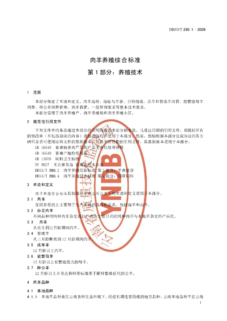 DB53/T 280.1-2008 肉羊养殖综合标准 第1部分:养殖技术