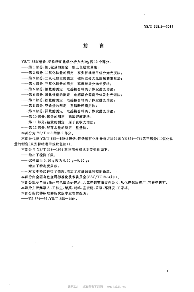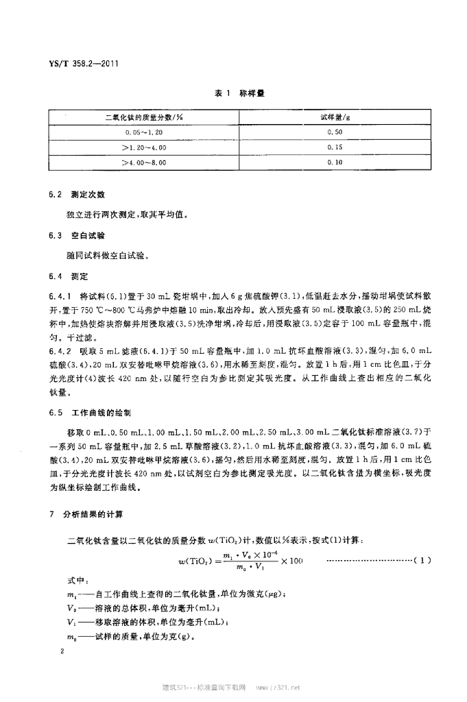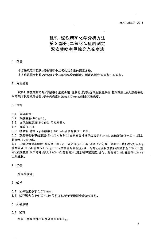 YS/T 358.2-2011 钽铁、铌铁精矿化学分析方法 第2部分:二氧化钛量的测定双安替吡啉甲烷分光光度法