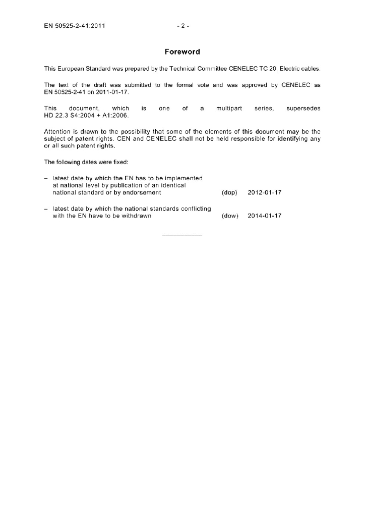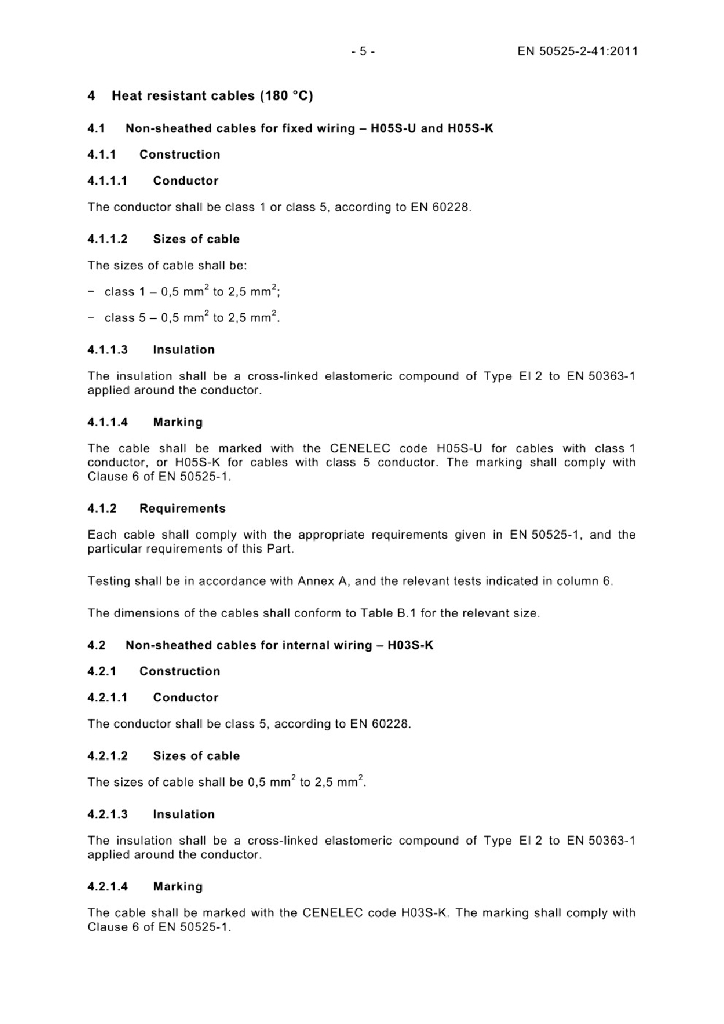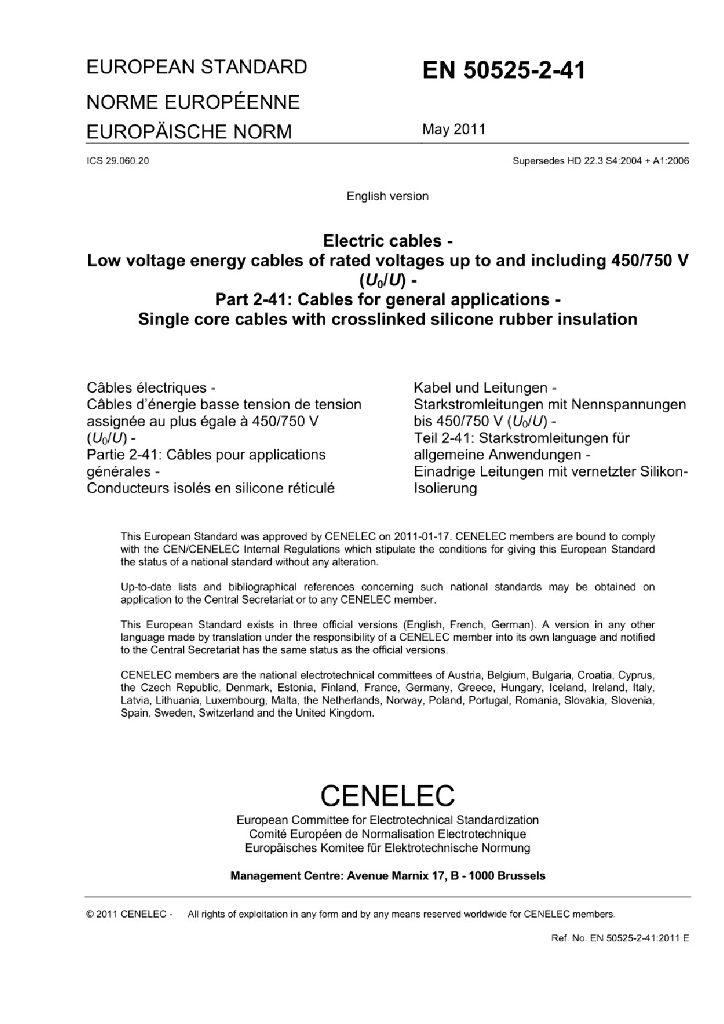 EN 50525-2-41:2011 额定电压450/750V及以下低压节能电缆 - 第2-41部分 通用电缆 - 带有交联硅橡胶绝缘的单芯电缆