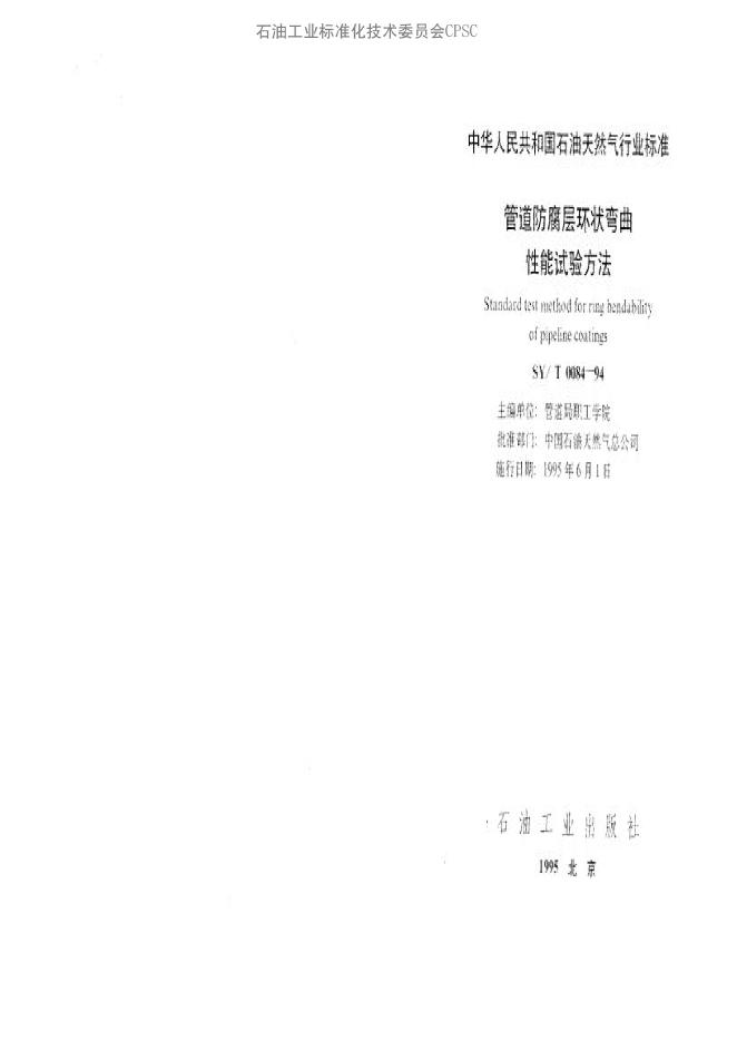 SY/T 0084-1994 管道防腐层环状弯曲性能试验方法