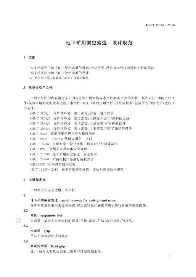 GB/T 25652-2026 地下矿用架空索道 设计规范