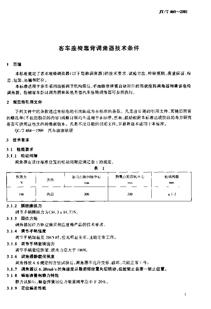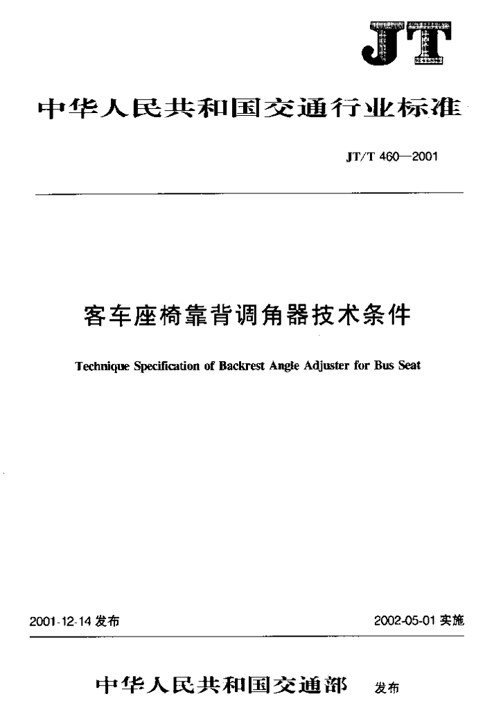 JT/T 460-2001 客车座椅靠背调角器技术条件